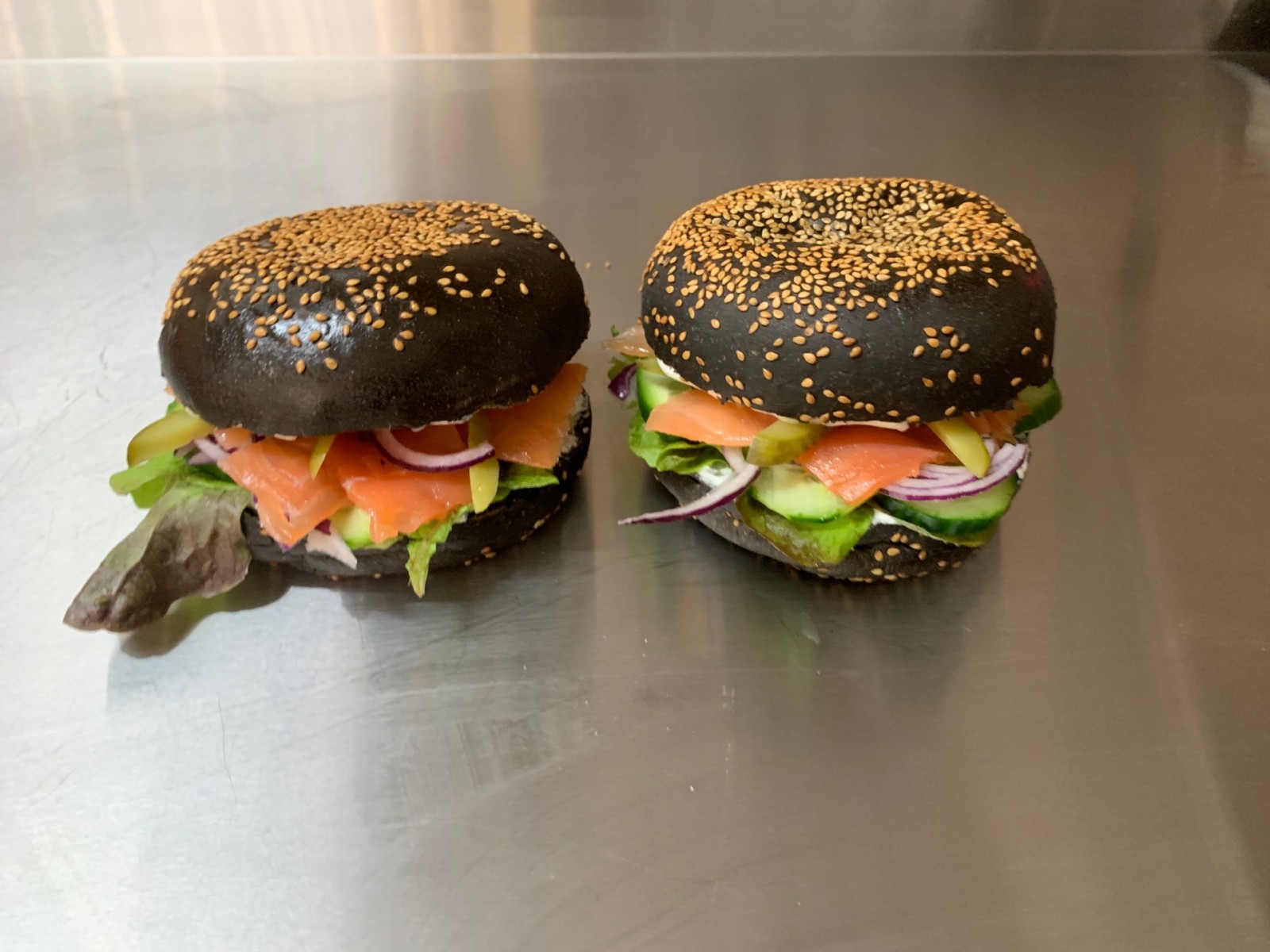 Sandwich le viking composé de feuilles de chêne rouge d’un producteur local à moins d’un kilomètre du restaurant fromage blanc 3 % de matière grasse poivre Tabasco oignons rouges concombres cornichons tous les légumes sont coupés du jour et sans oublier le saumon fumé de Norvège